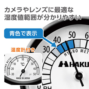相機和鏡頭存放的環境濕度值範圍以藍色顯示,存放地點的情況一目了然。配有方便的溫度計。